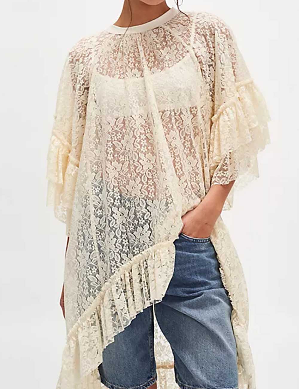 Ladies Floral Lace See Through Irregular Mid Sleeves Blouse