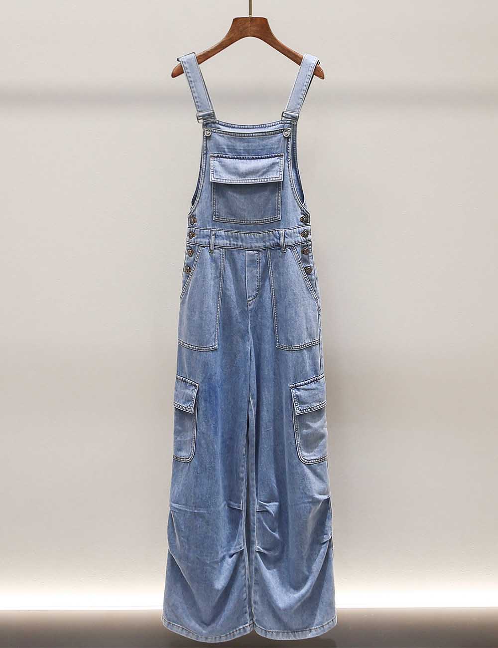 Ladies Strape Shoulder Overall Pocket Wide Leg Denim Jumpsuit