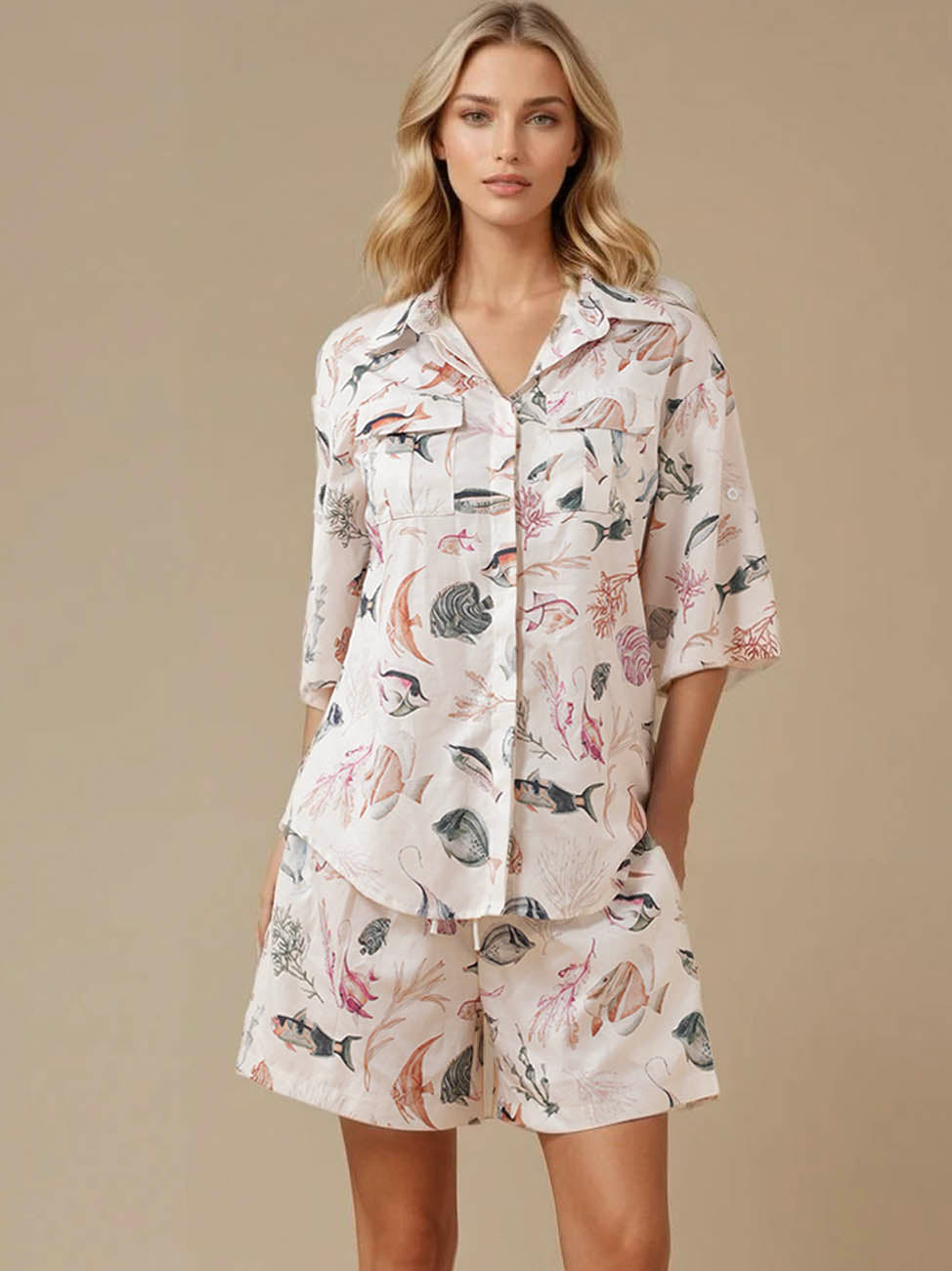 Ladies Turndown Collar Short Sleeves Top & Shorts Denim Set