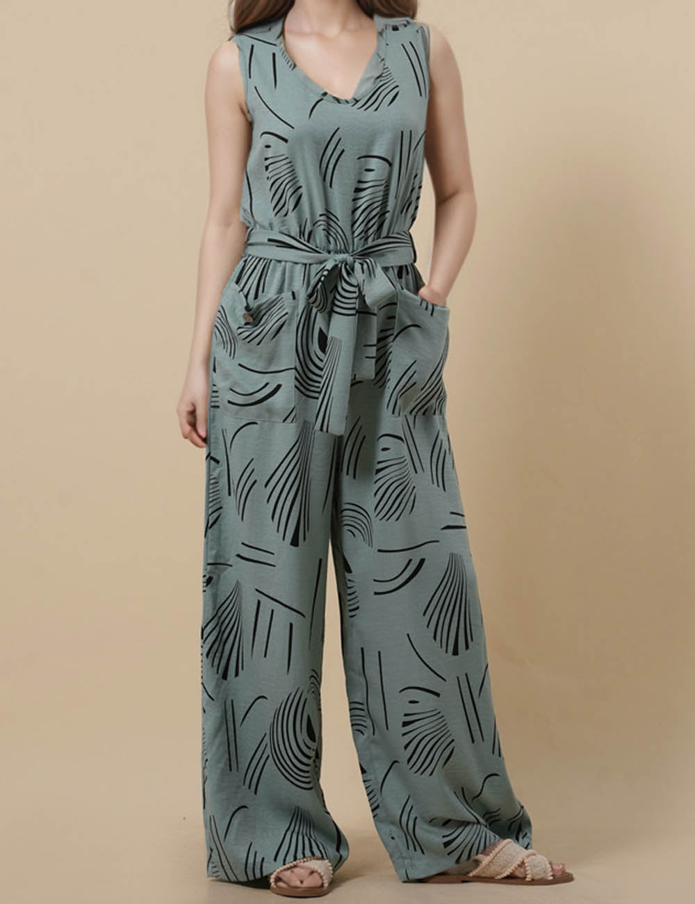 Ladies String Tie Color Block Pocket Wide Leg Jumpsuit SKJ851147