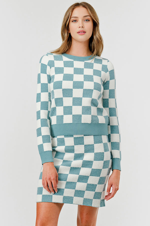 Round Neck Color Contrast Checkered Sweater & Skirt Set DBLST4020