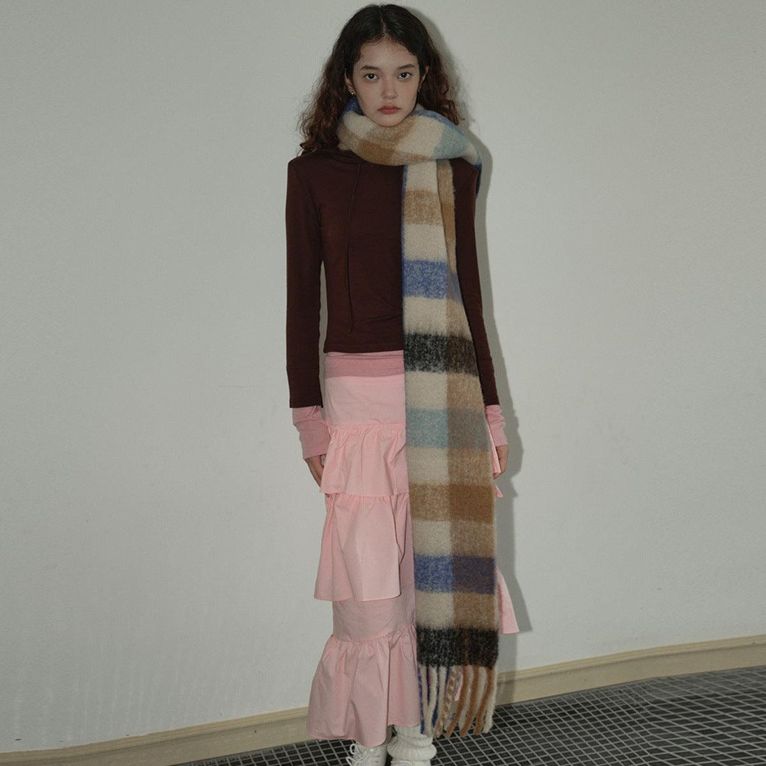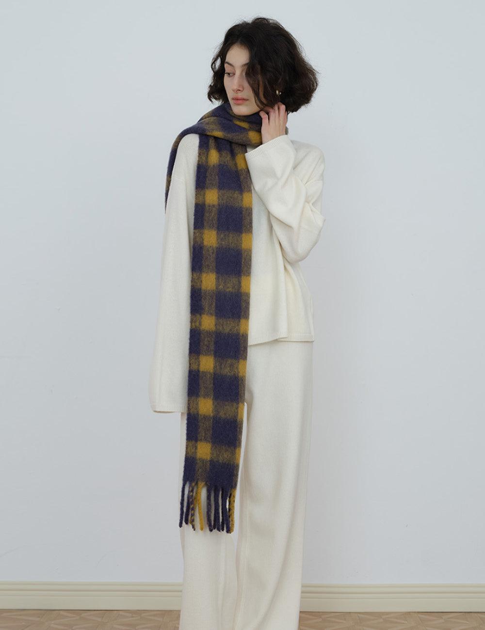 Ladies Color Block Checked Mohair Fringe Knit Scarf