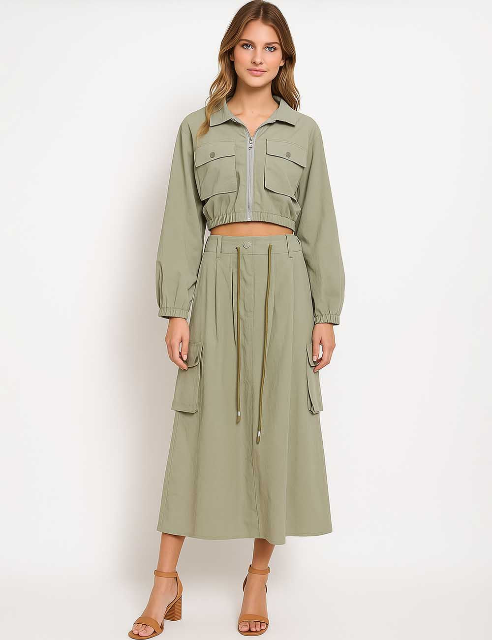 Ladies V-Neck Hoodied Ruched Cropped Top & Maxi Skirt Set