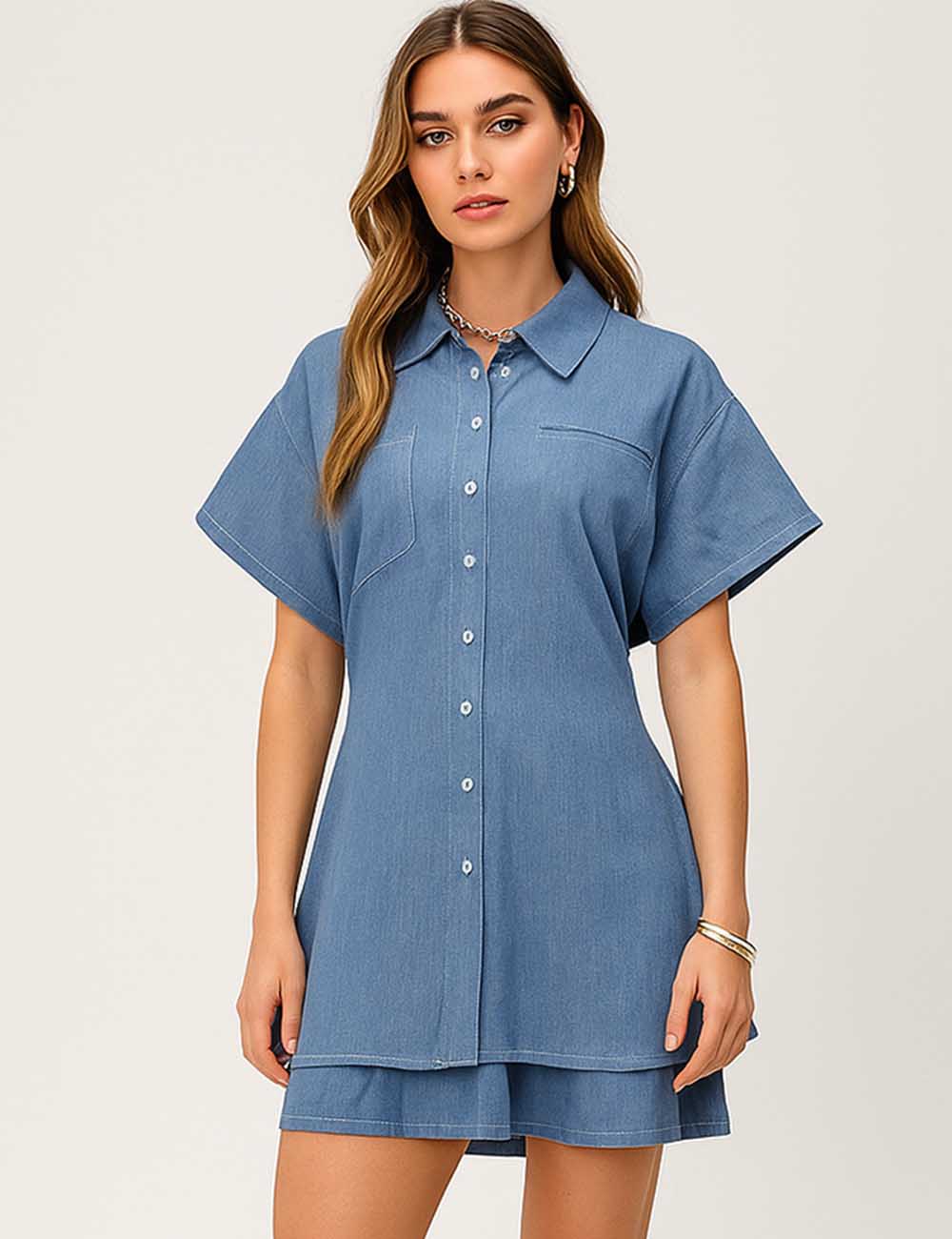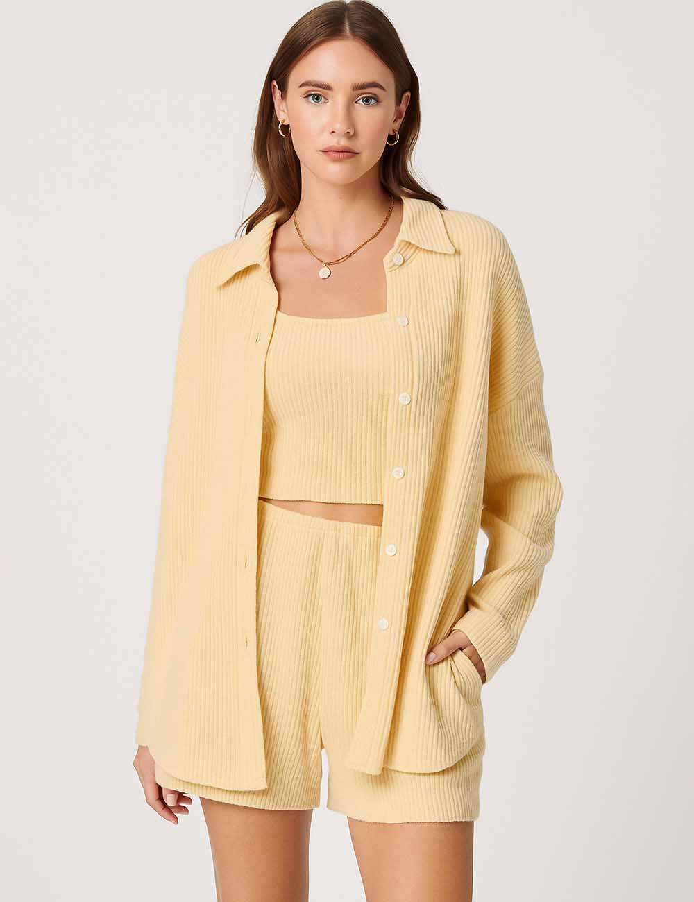 Ladies Ribbed Tube Top Button Down Shirt Shorts 3PCS Set