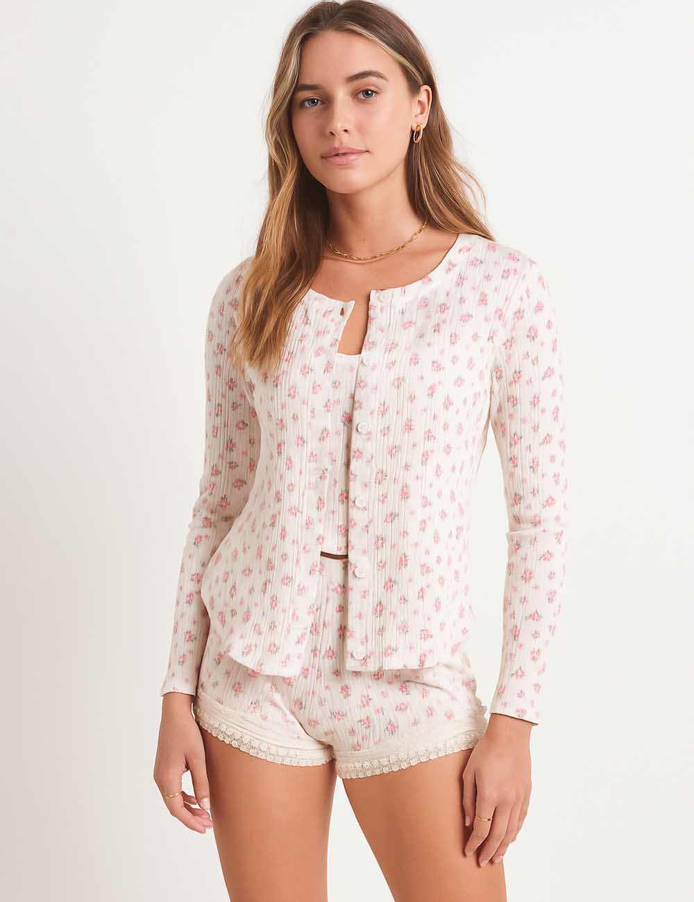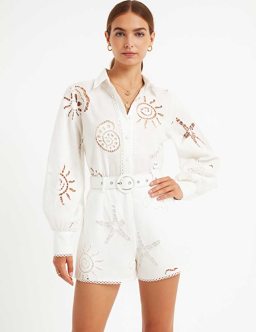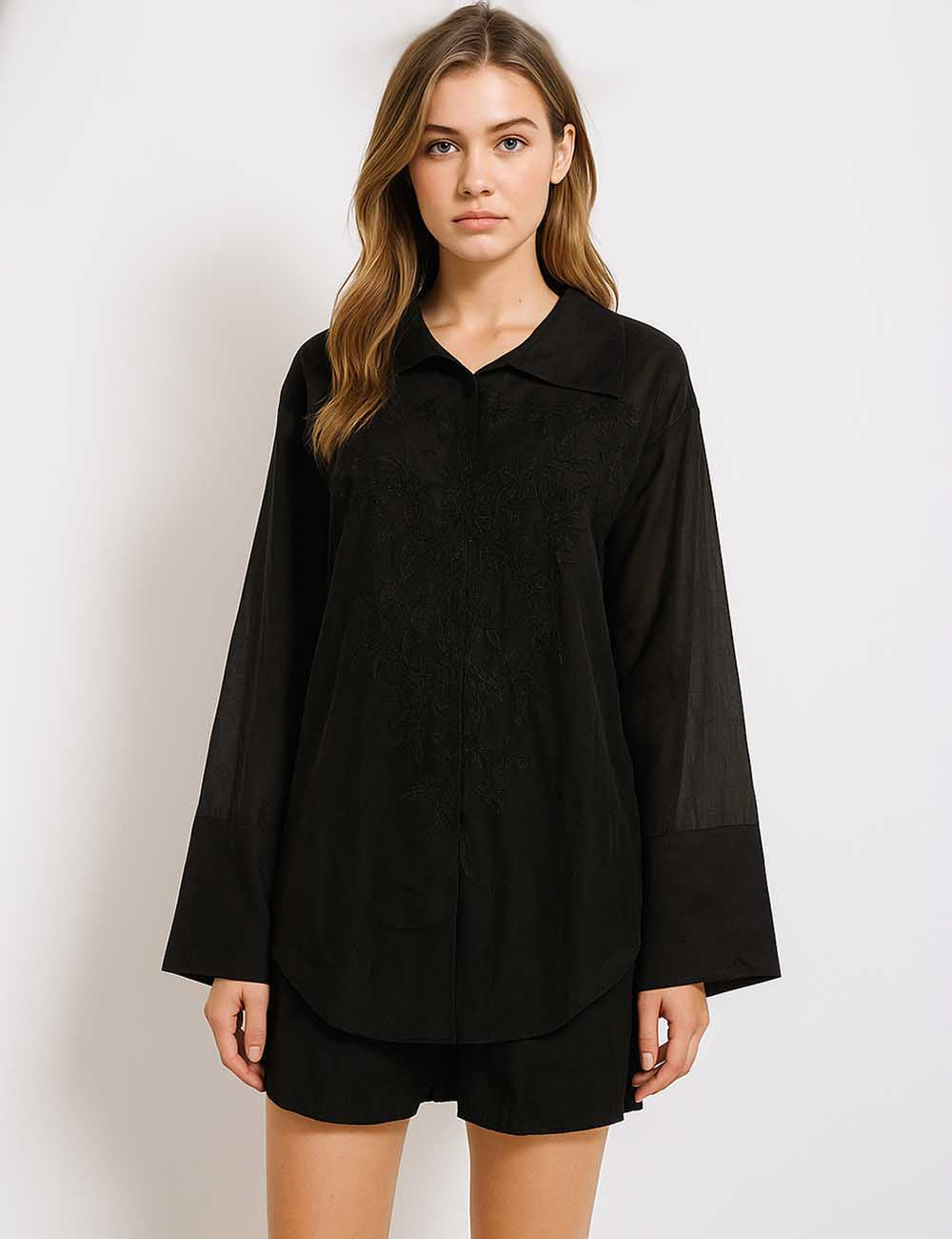 Ladies Embroidery Eyelet Hollow Button Down Shirt & Shorts Set