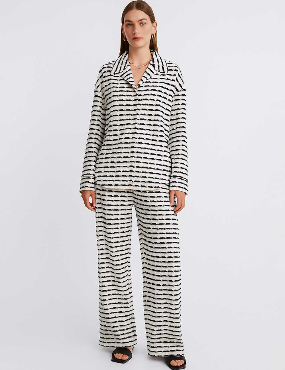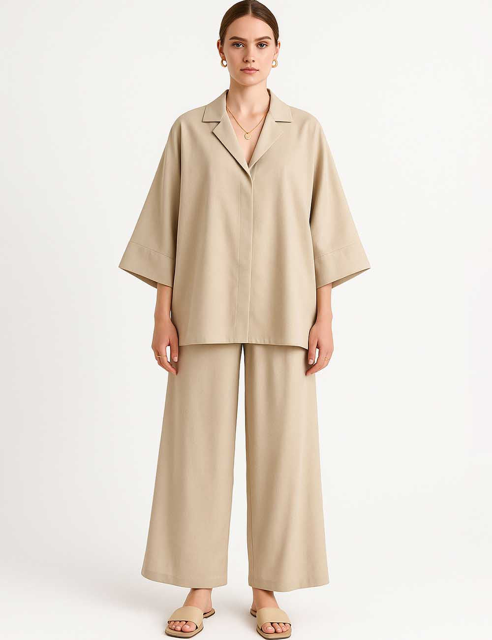 Ladies Turndown Collar Half Sleeves Wide Leg Shirt & Pants Set