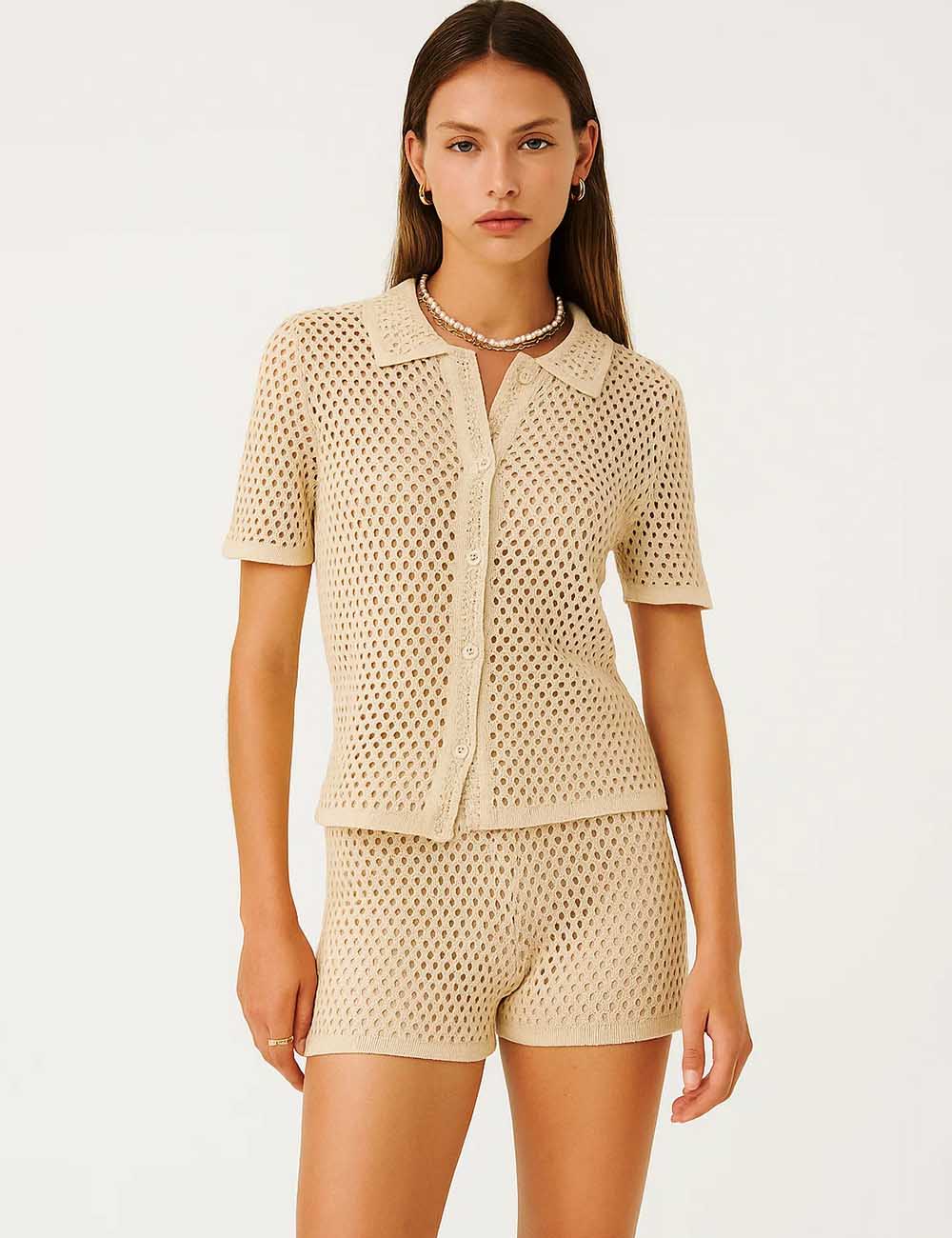 Ladies Hollow Out Knit Short Sleeves Shirt & Shorts Set