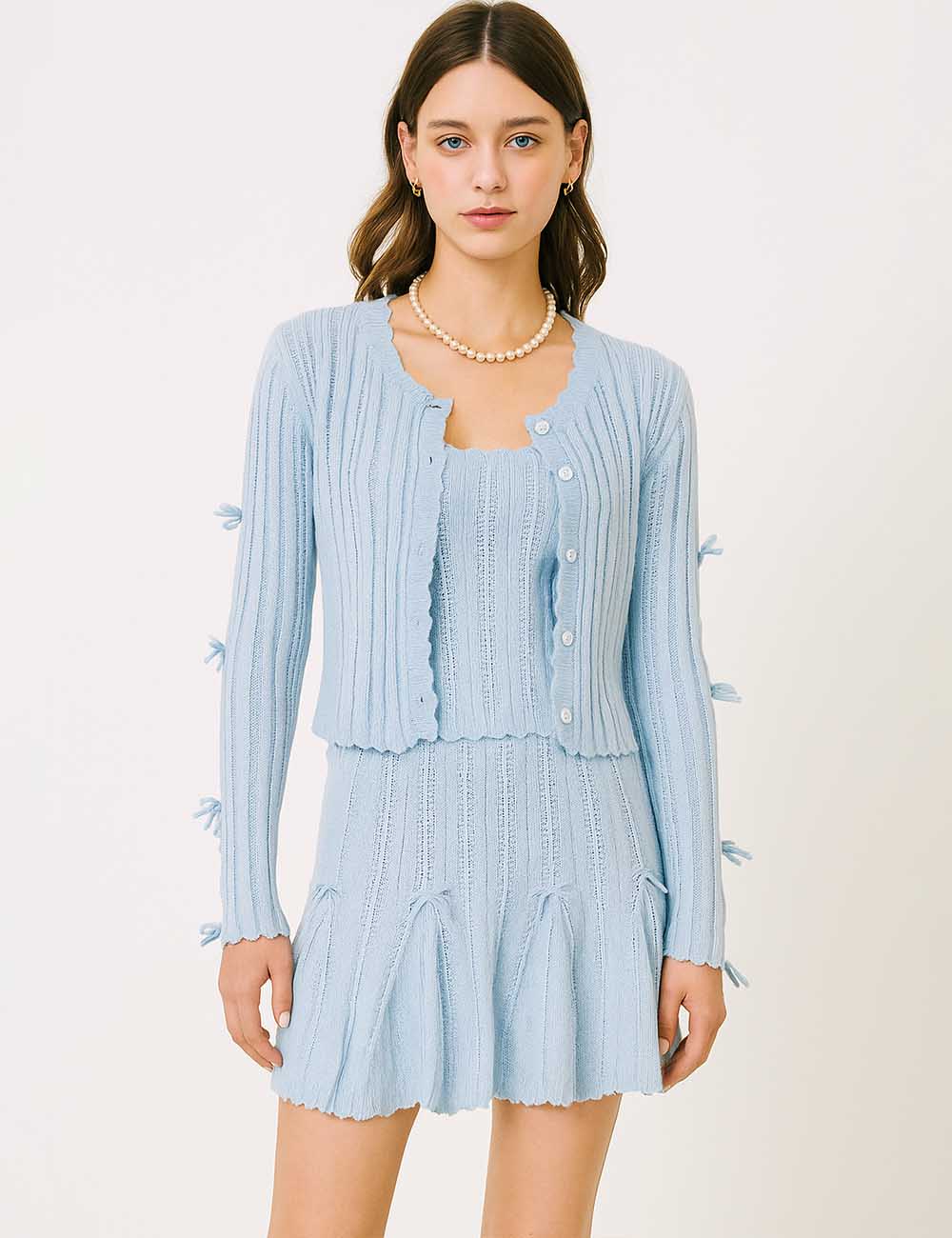 Ladies Bowknot Knit Cami Top & Button Cardigan & Mini Skirt Set