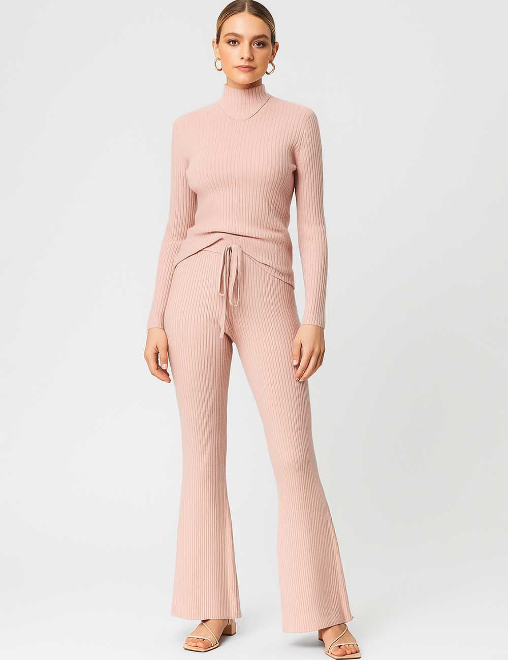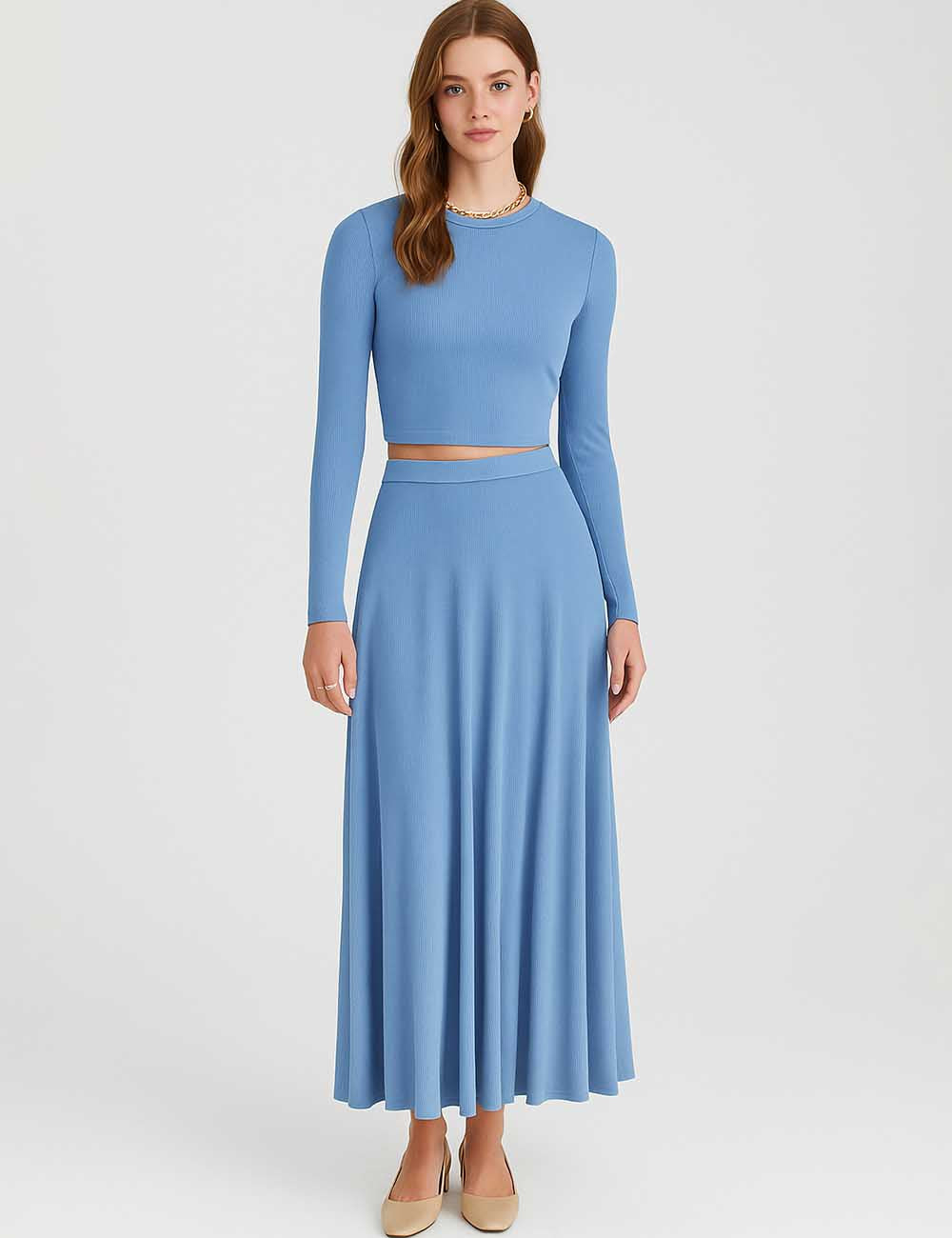 Ladies Stretch Ribbed Knit Round Neck Top & Skirt Set