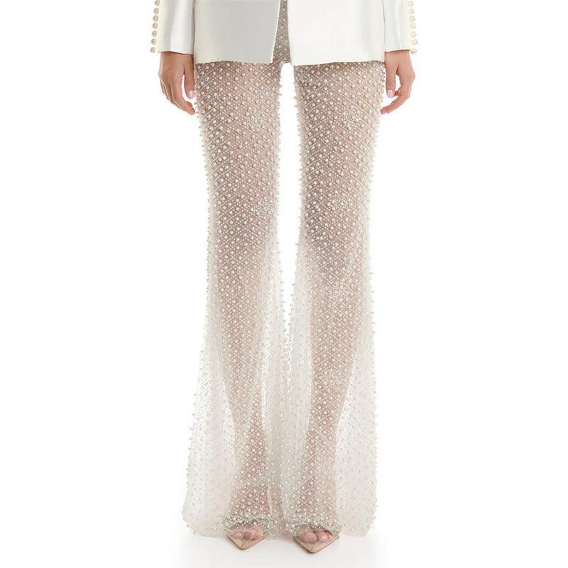 Ladies Elegant Pearl Stud See Sheer Flare Pants SXP500717