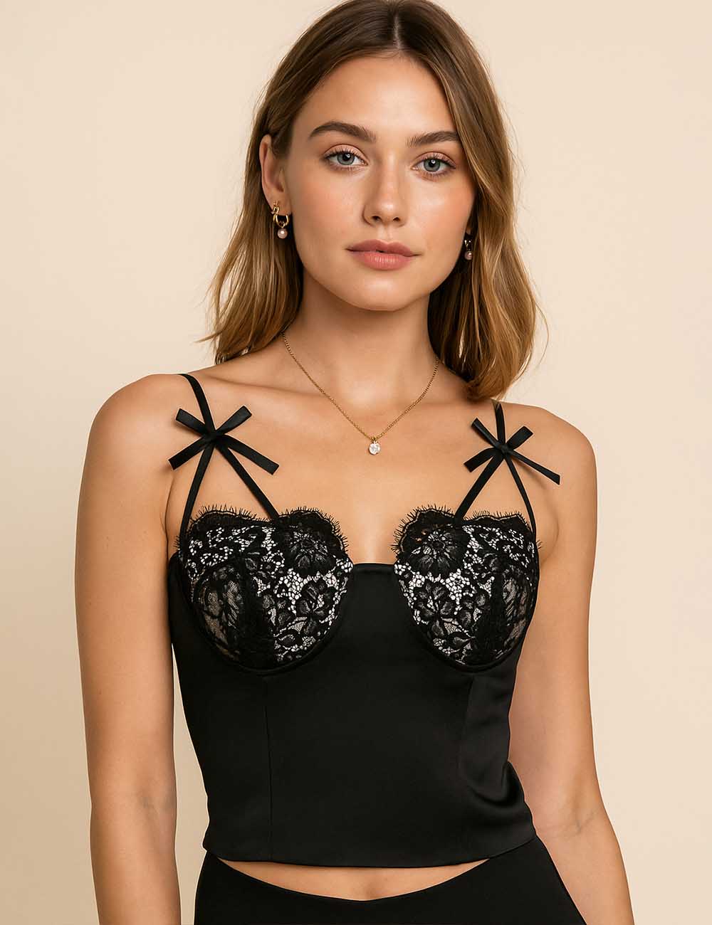 Ladies Contrast Panel Bow Sleeveless String Shoulder Corset Top