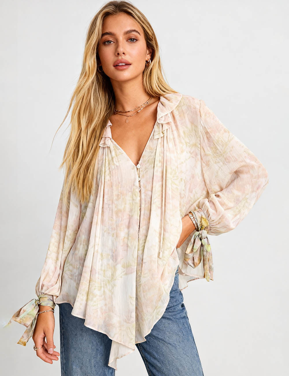 Ladies V-Neck Knot Ruffle Long Sleeves Pullover Shirt 8SKT51317