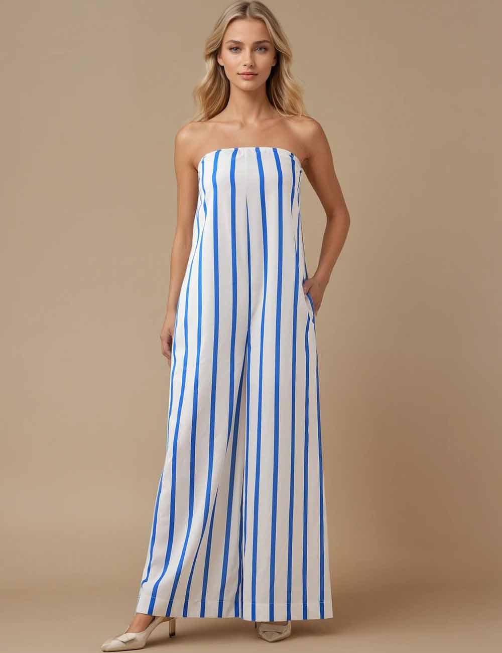 Ladies Color Block Striped Strapless Sleeveless Wide Leg Jumpsuit