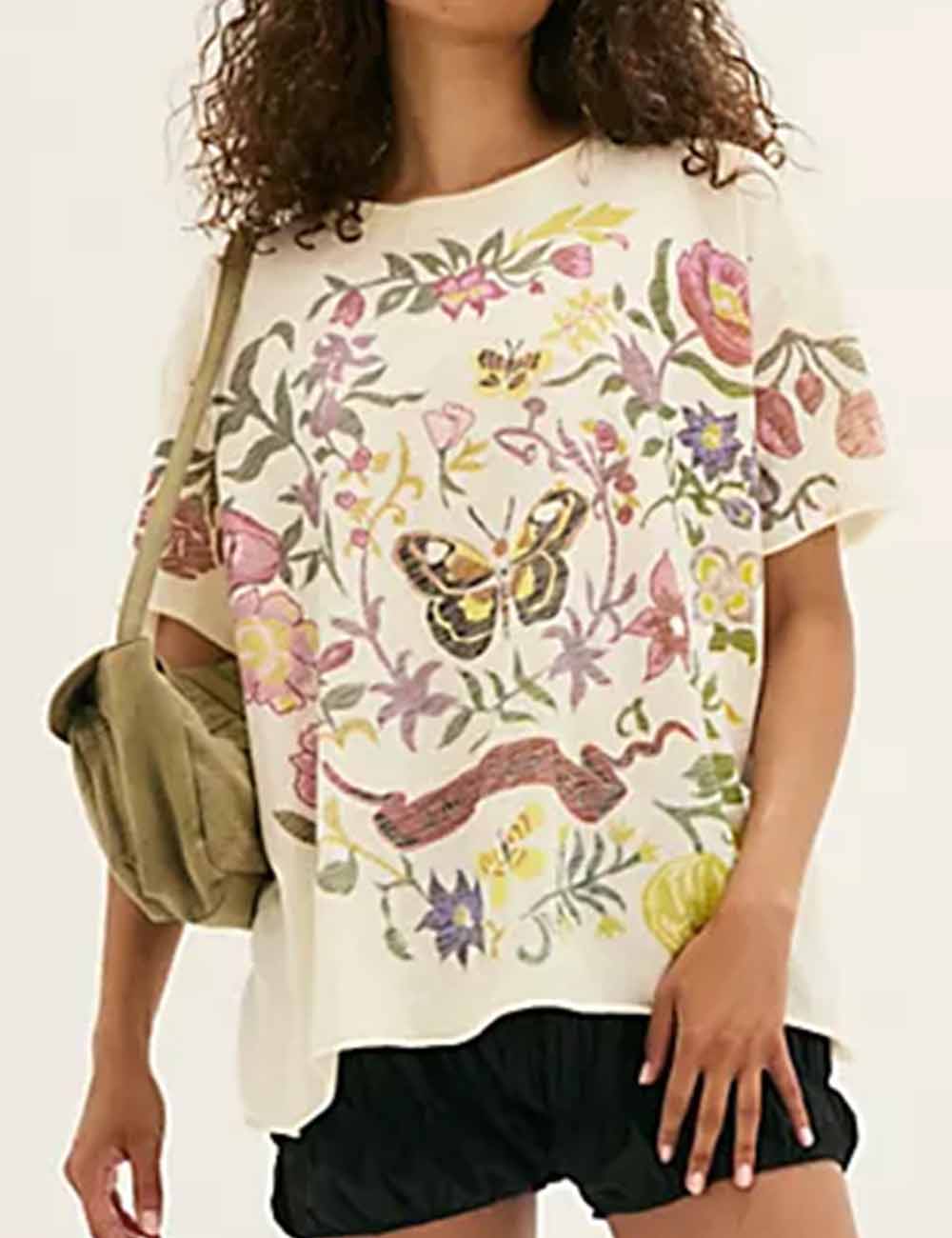 Ladies Multicolor Embroidery Crew Neck Short Sleeves T-Shirt