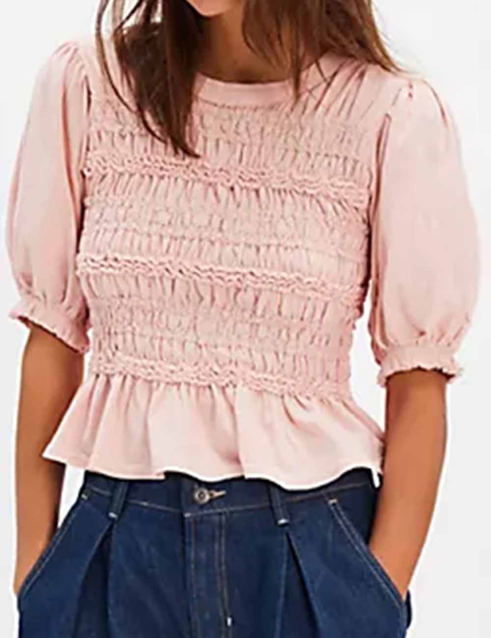 Ladies Lace Ruffle Smocked Bodice Puff Short Sleeves Top