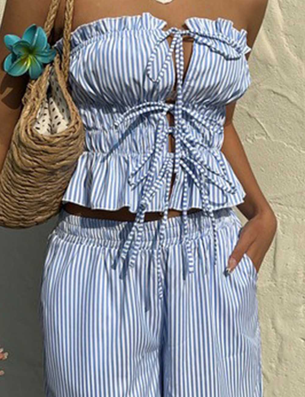 Ladies Color Block Striped String Tie Tube Top & Pants Set
