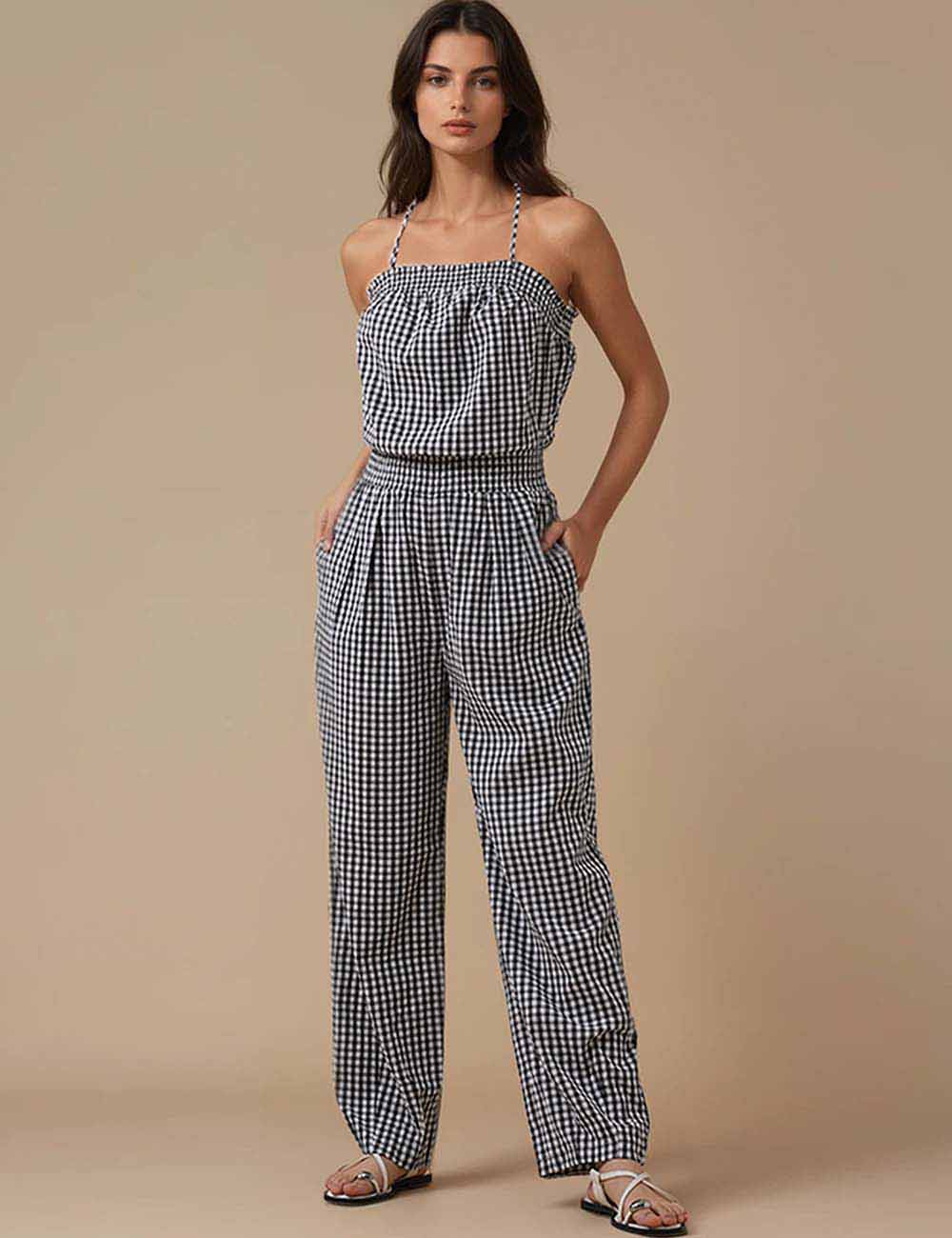 Ladies Solid Color Stripe Shoulder Backless Jumpsuit
