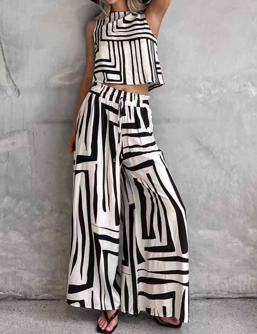 Ladies Color Block Print Sleeveless Tank Top & Pants 2PCS Set