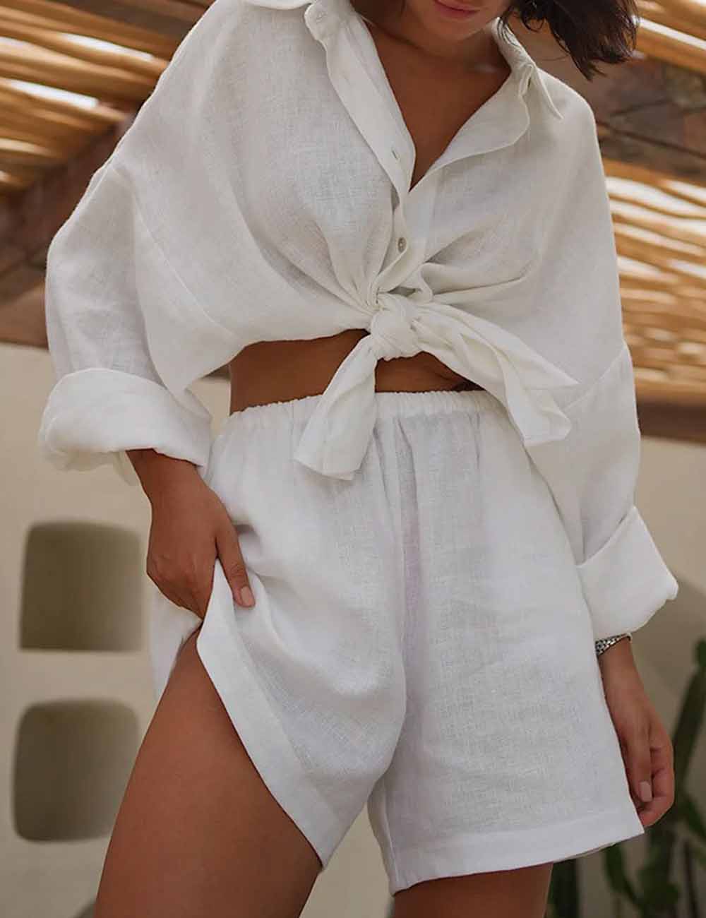 Ladies Solid Color Button Down Long Sleeves Shirt & Shorts Set
