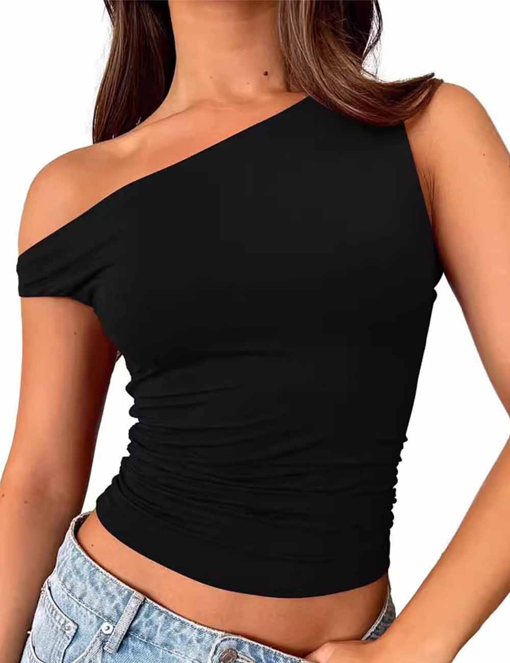 Ladies Solid Color Ruched One Shoulder Short Sleeves Top