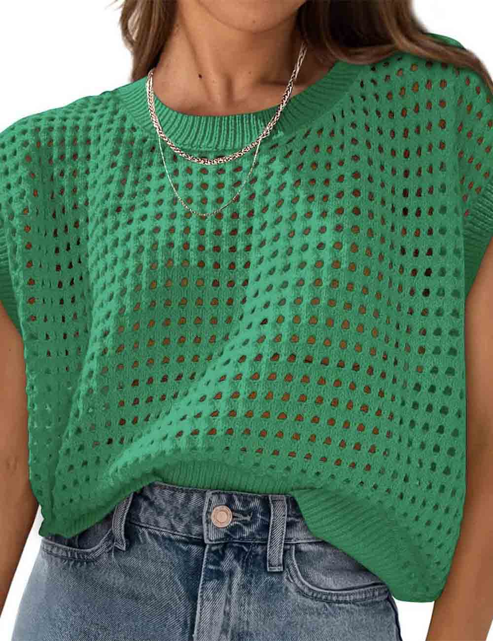 Ladies Solid Color Round Neck Sleeveless Hollow Out Knit Vest