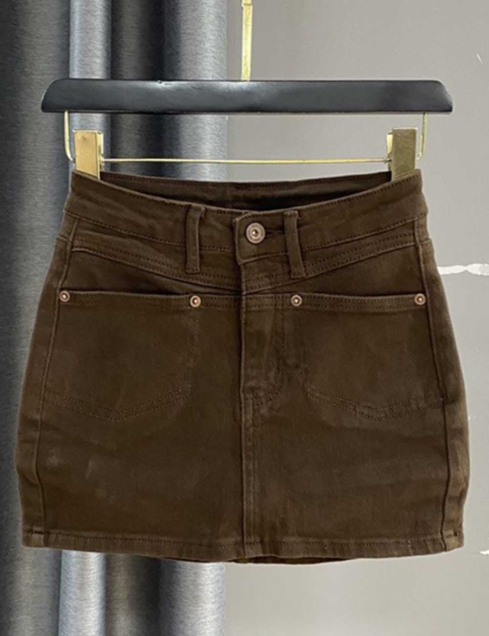 Ladies Solid Color Button Pocket Hip Wrap Denim Mini Skirt