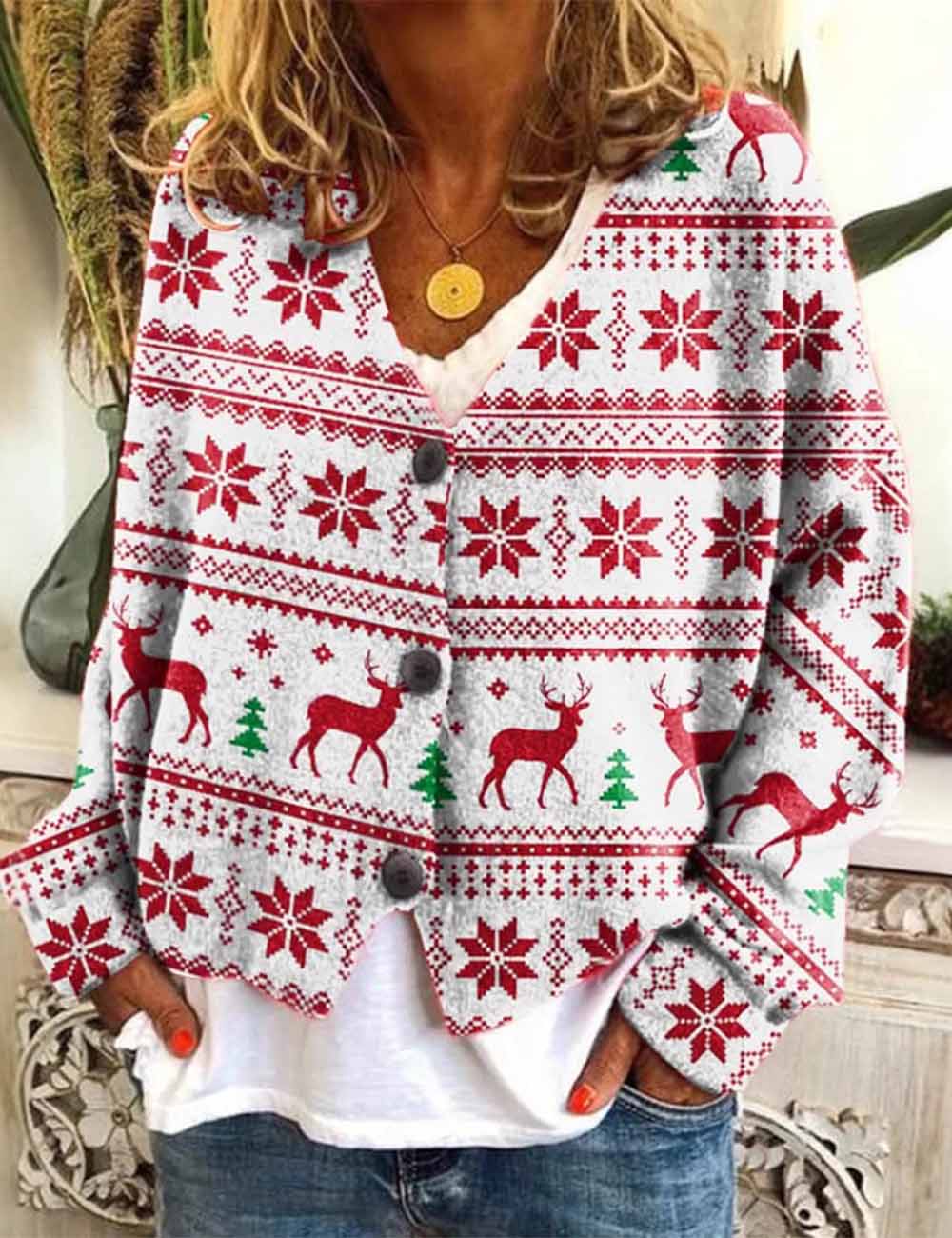 Ladies V Neck Button Long Sleeves Digital Print Cardigan