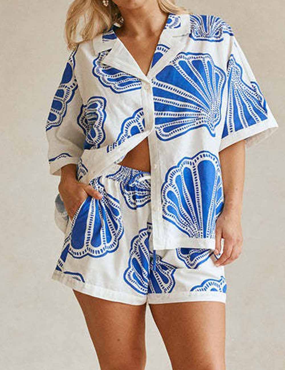 Ladies Linen Blend Seashell Print Short Sleeves Shirt & Shorts 2PCS Set