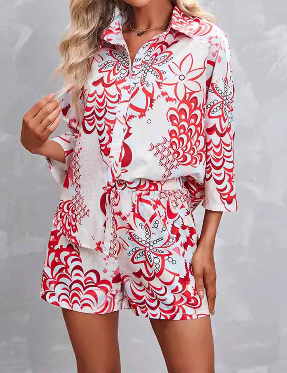 Ladies Floral Print Turndown Collar Midi Sleeves Shirt & Shorts Set