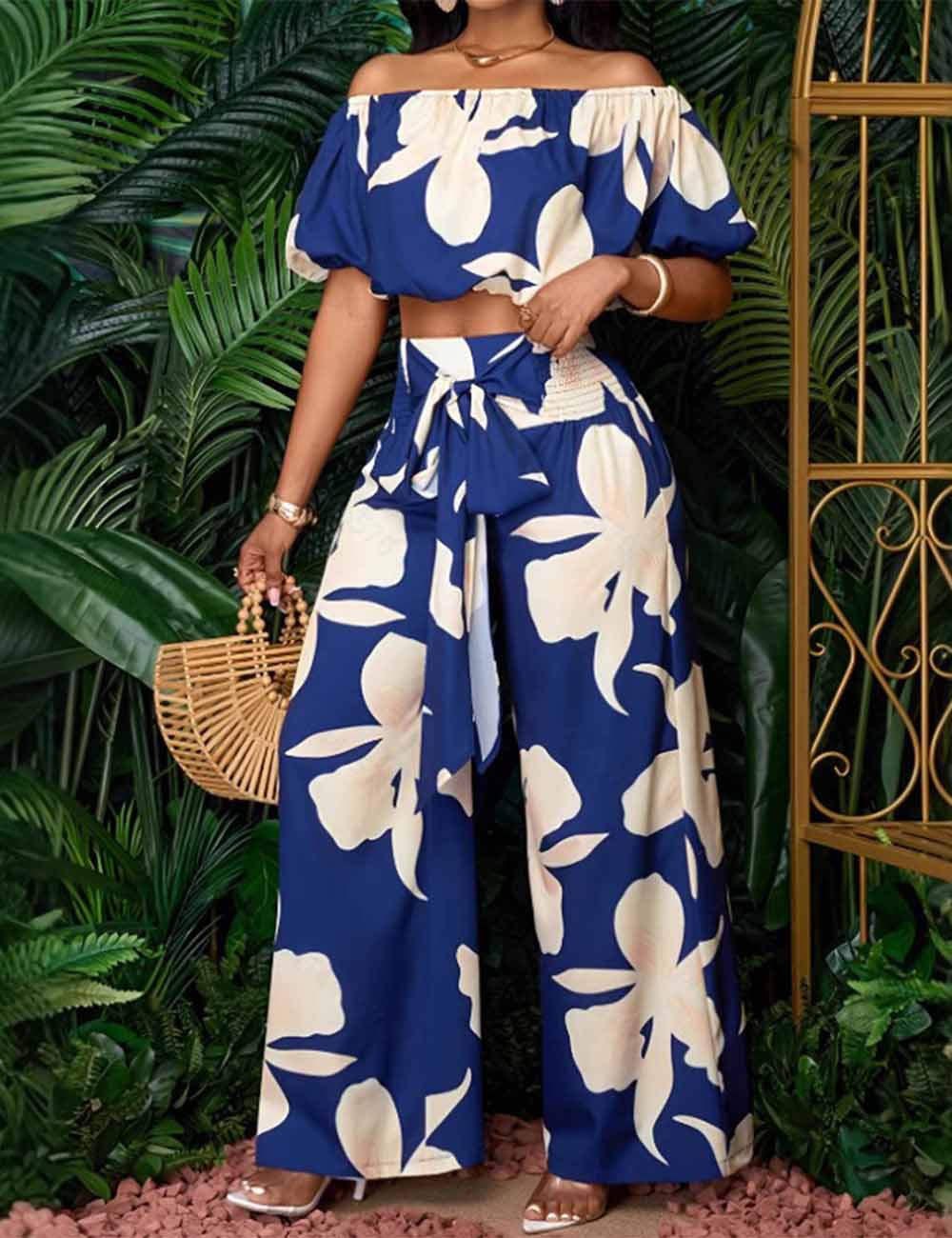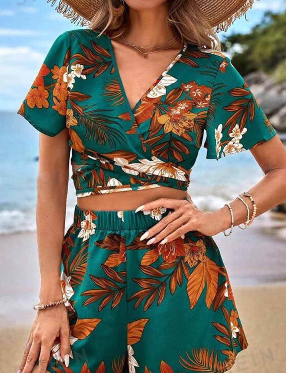 Ladies Botanical Print Beach Wrap Cropped Top & Shorts Set