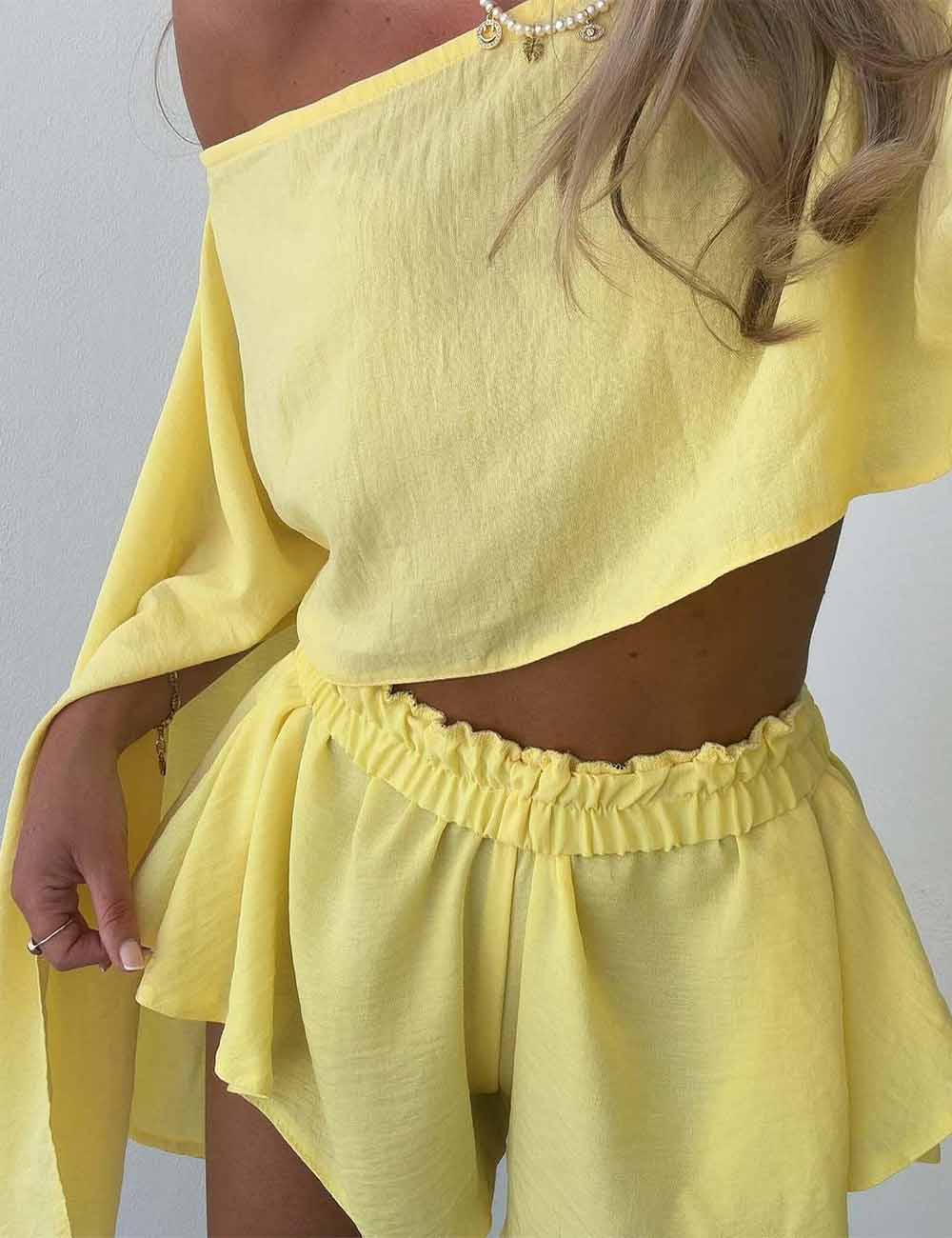 Ladies Solid Color Off-Shoulder Long Sleeves Cropped Top & Shorts Set