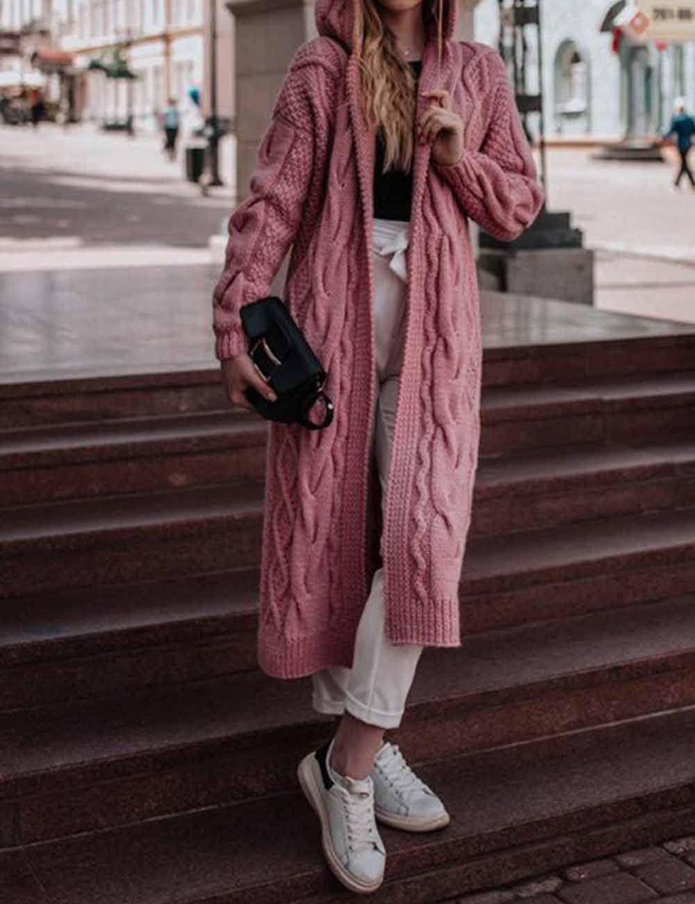 Ladies Solid Color Hoodie Cable Knit Sweater Coat Cardigan SKT5KC115