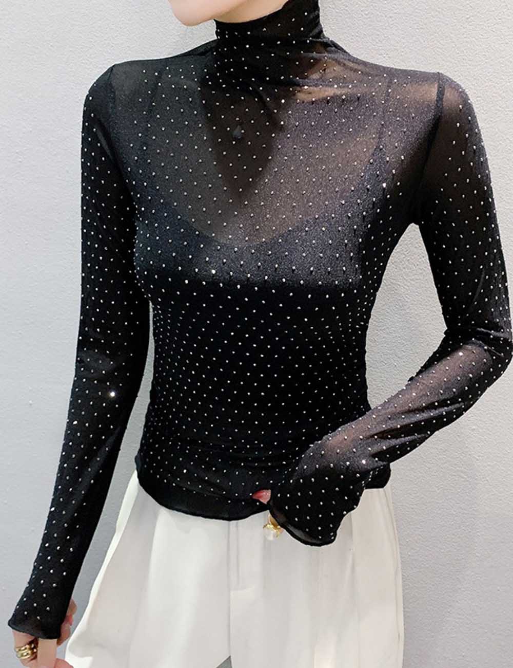 Ladies Turtleneck Rhinestones Mesh Long Sleeves Layering Top