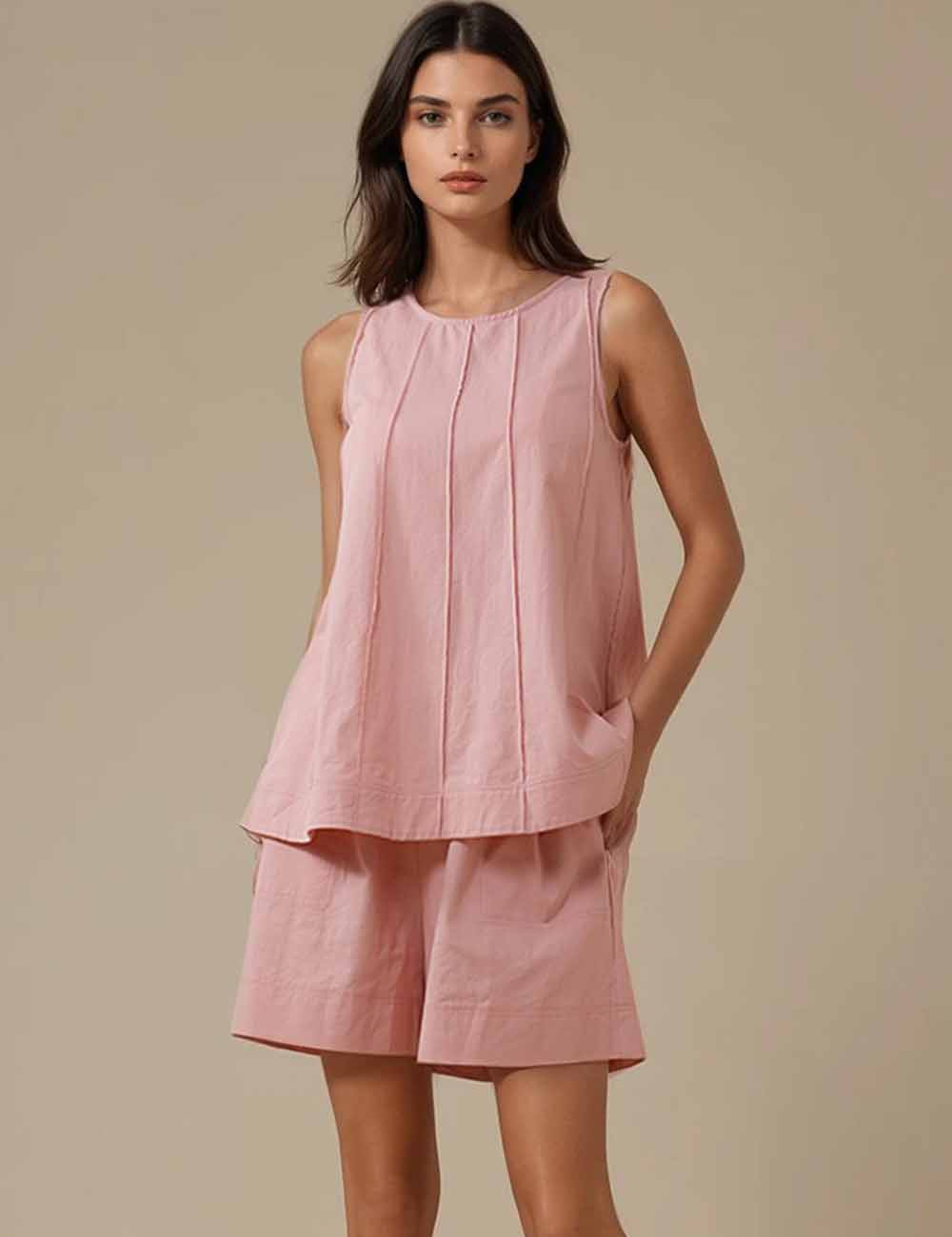 Ladies Solid Color Smocking Tank Top & Shorts 2PCS Set