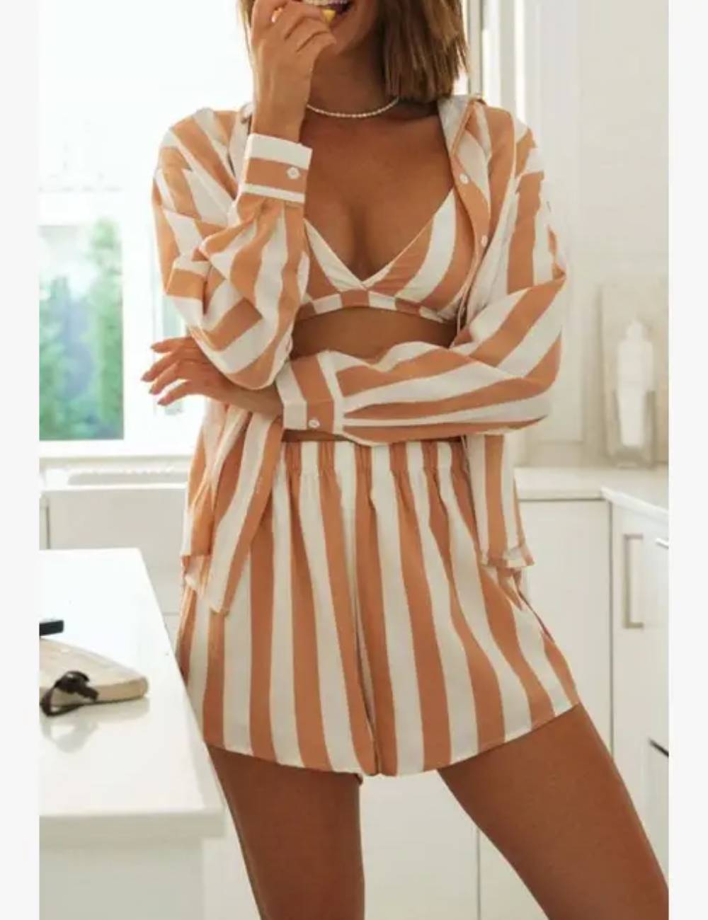 Ladies Stripe Long Sleeves Shirt with Shorts 2PCS Set TZ8866