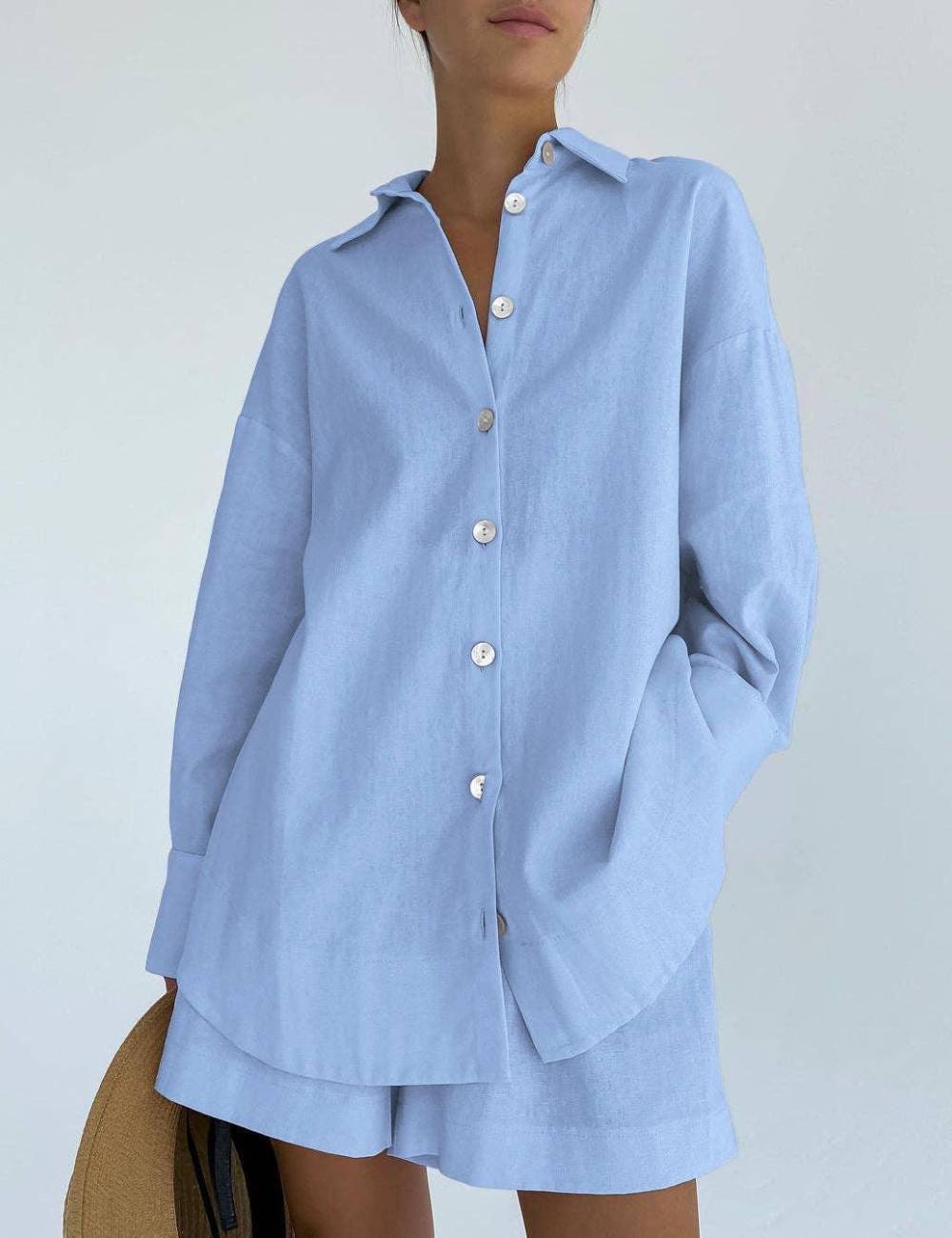 Ladies Solid Color Button Down Long Sleeves Shirt & Shorts Set