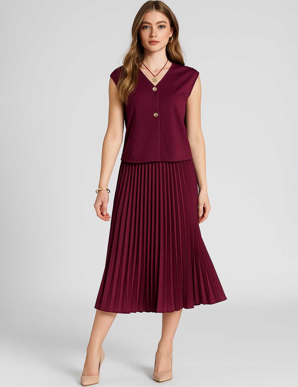 Ladies V-Neck Metal Button Knit Vest & Pleated Skirt 2PCS Set