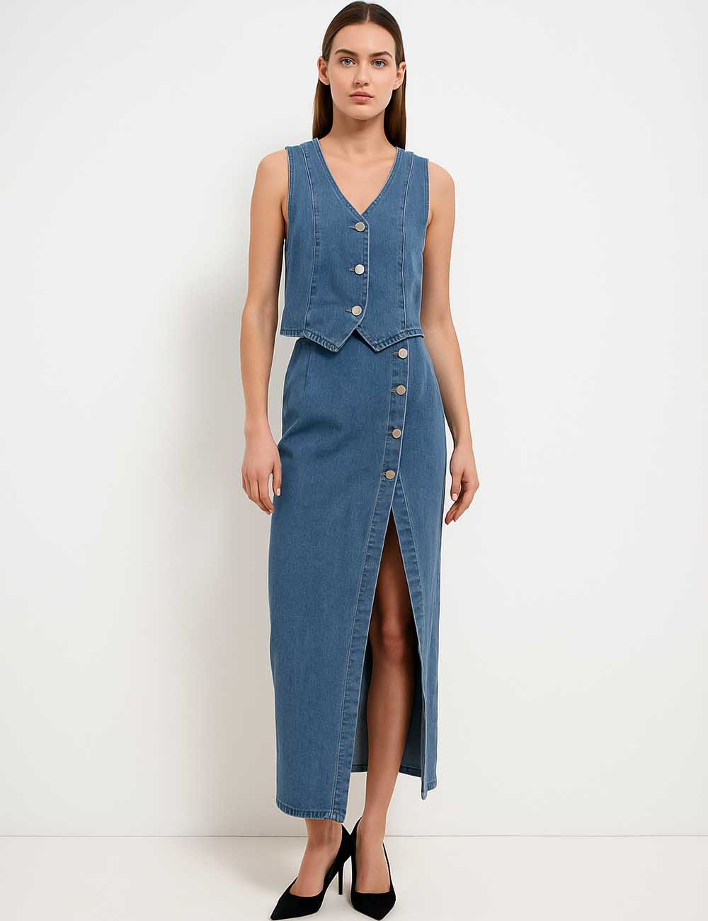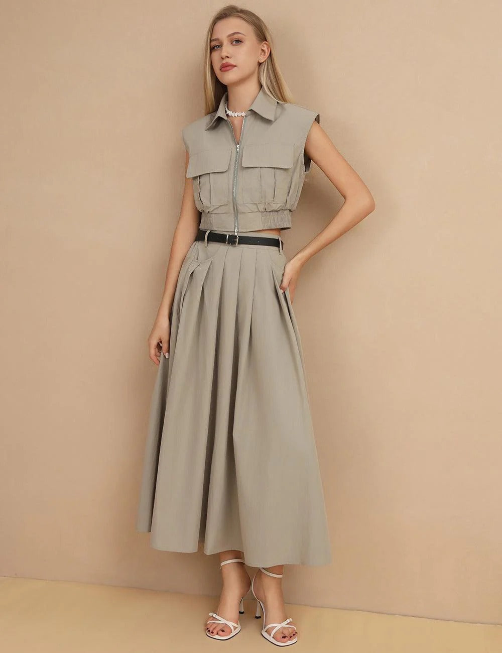 Ladies Solid Color Linen Blend Button Pocket Vest & Skirt Set