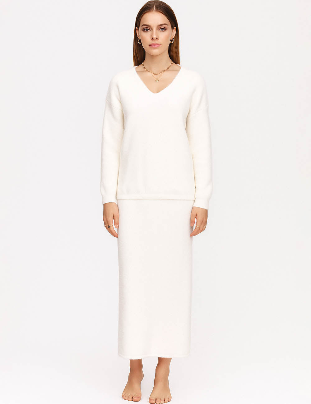 Ladies Faux Mink Fur V-Neck Sweater Top & Midi Skirt Set