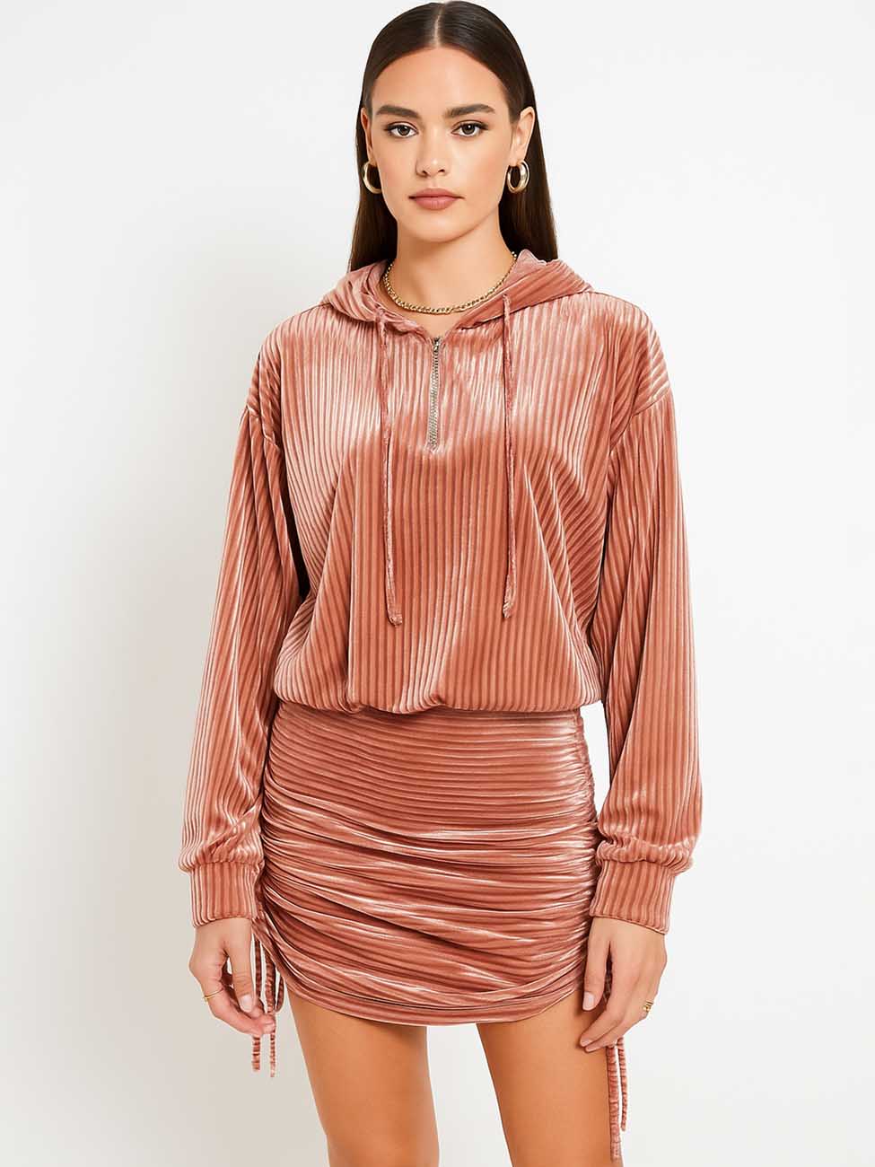 Ladies V-Neck Hoodied Ruched Cropped Top & Maxi Skirt Set