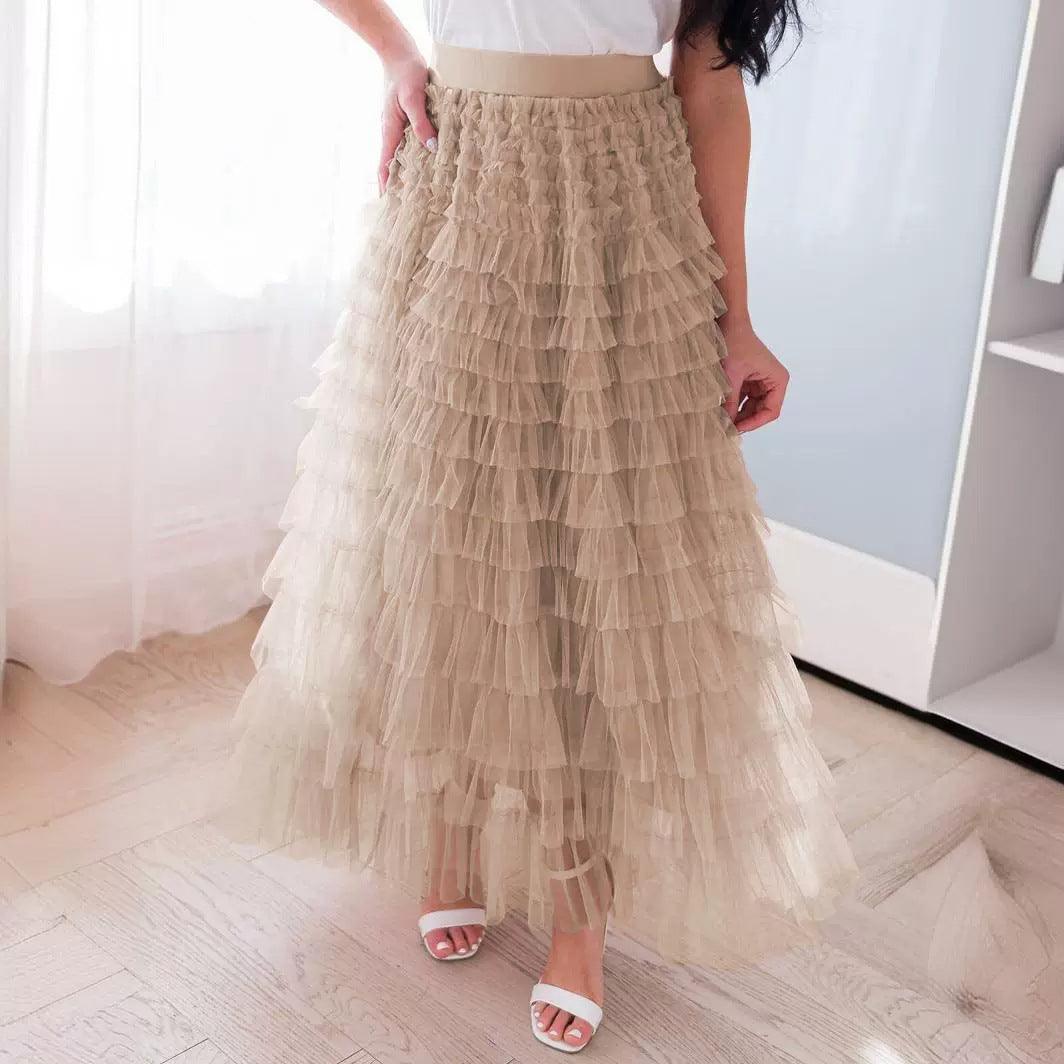 Ladies Solid Color Ruffle Guazy Midi Skirt SKS41176