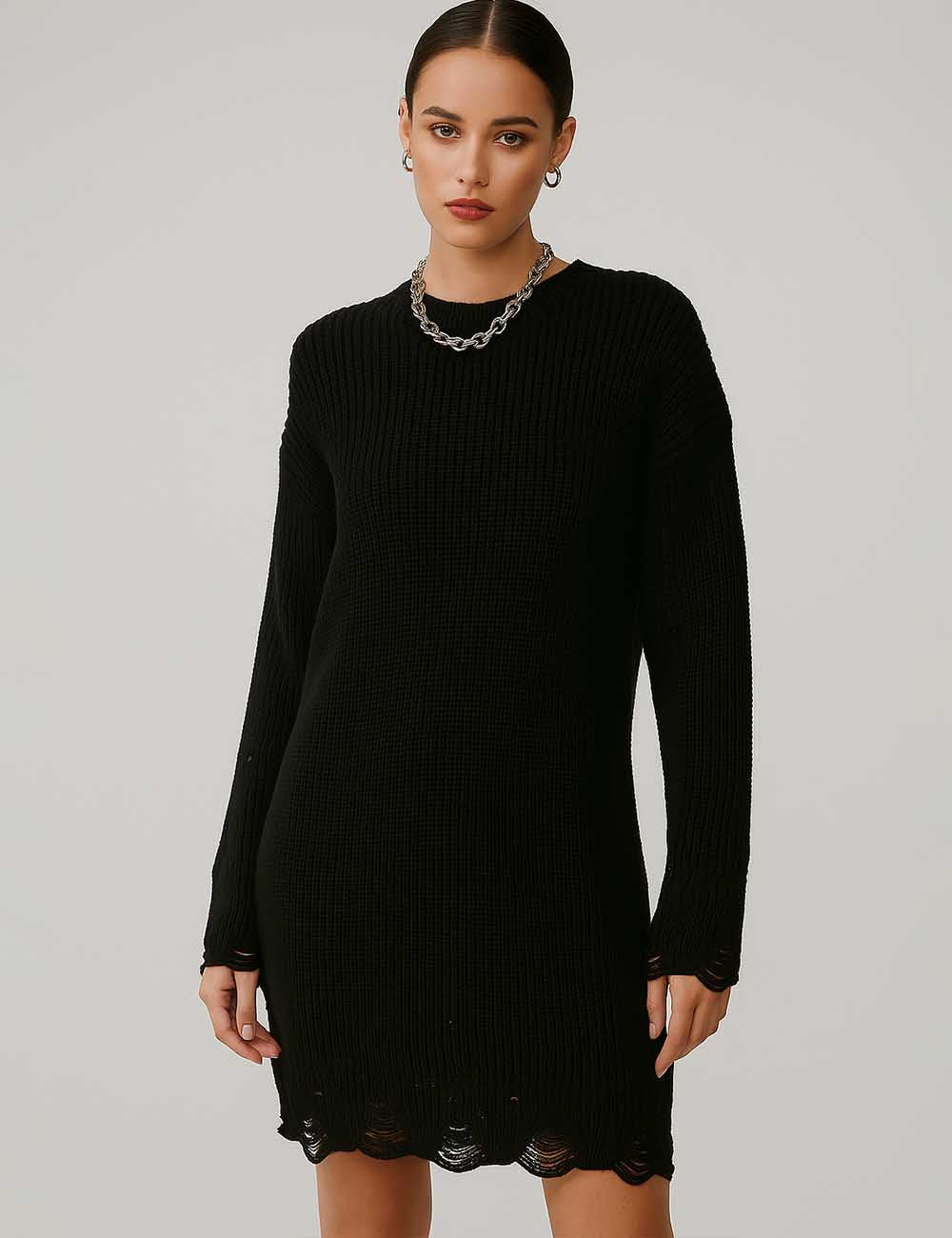 Ladies Solid Color Round Neck Distressed Knit Mini Dress