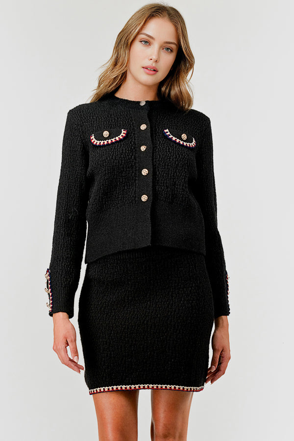 Ladies Polo Collar Color Block Cable Knit Top & Skirt 2PCS Set