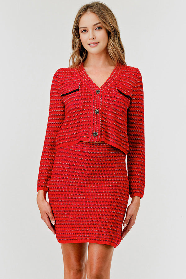 Ladies Solid Color V-Neck Knit Top & Skirt Set