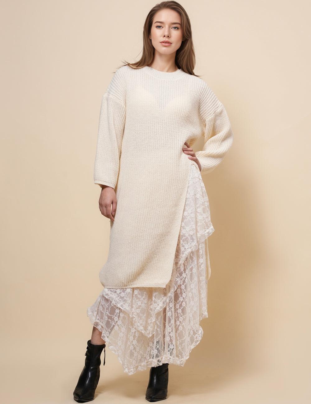 Ladies High Neck Side Split Sweater Midi Dress SKD4885