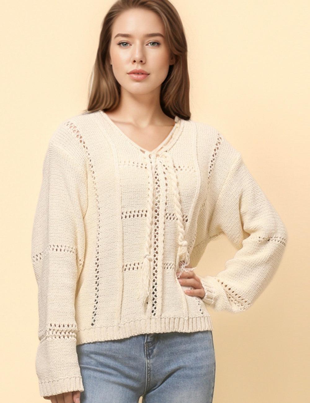 Ladies Hallow V-Neck Long Sleeves Pullover Sweater SKT4809