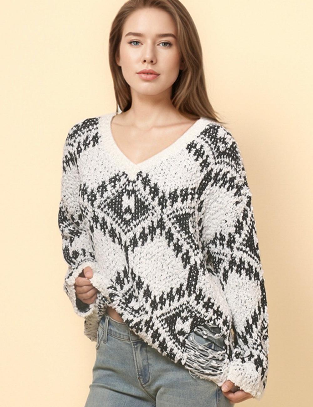Ladies Color Block Totem Bohemia V-Neck Sweater SKT4849