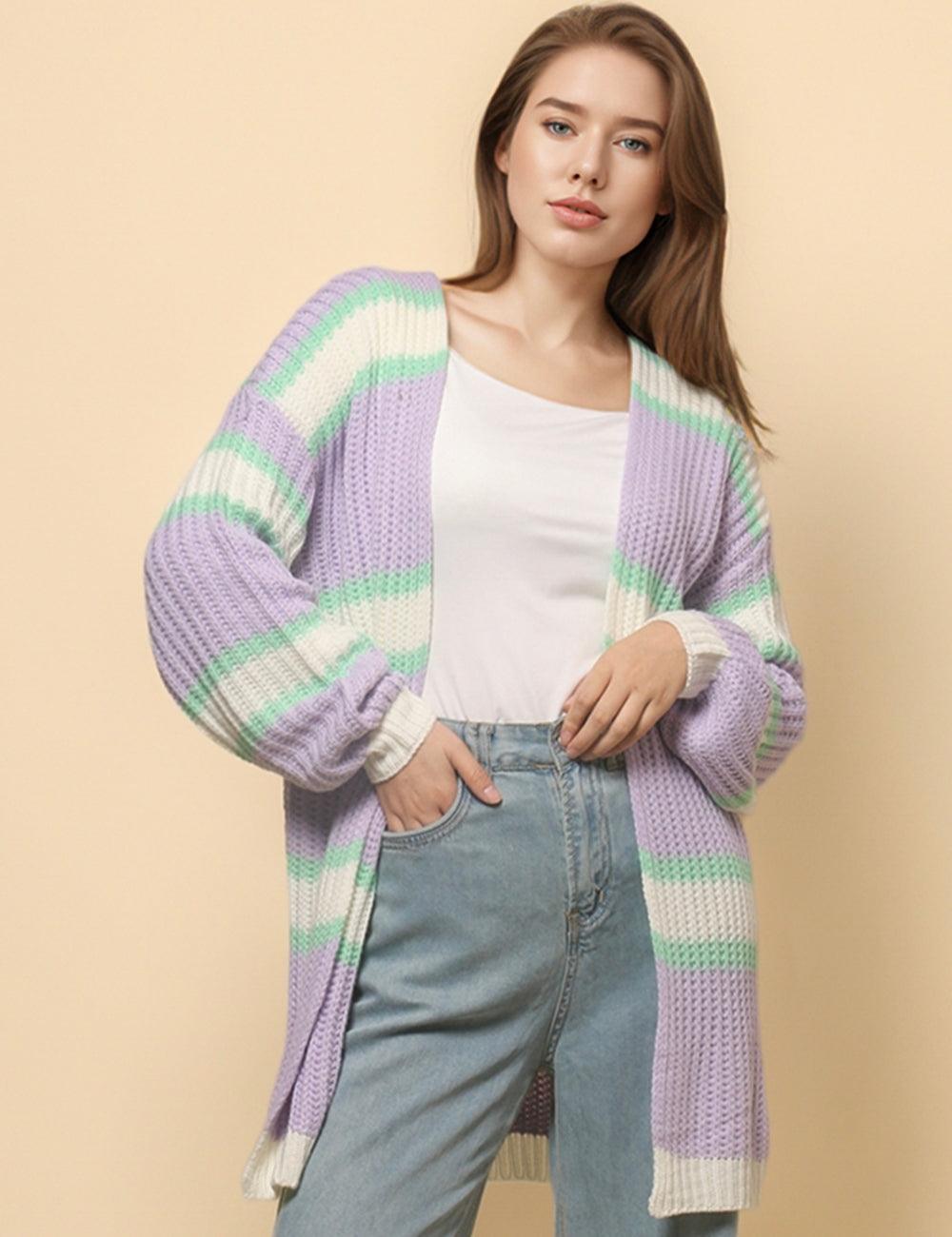 Ladies Macarons Color Stripe Open Front Cardigan SKT4774
