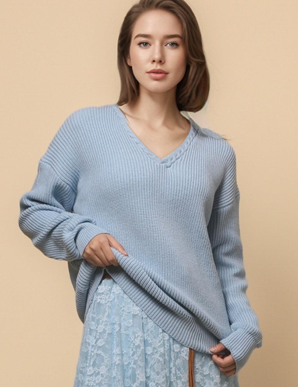 Ladies Solid Color V-Neck Pullover Sweater SKT4778
