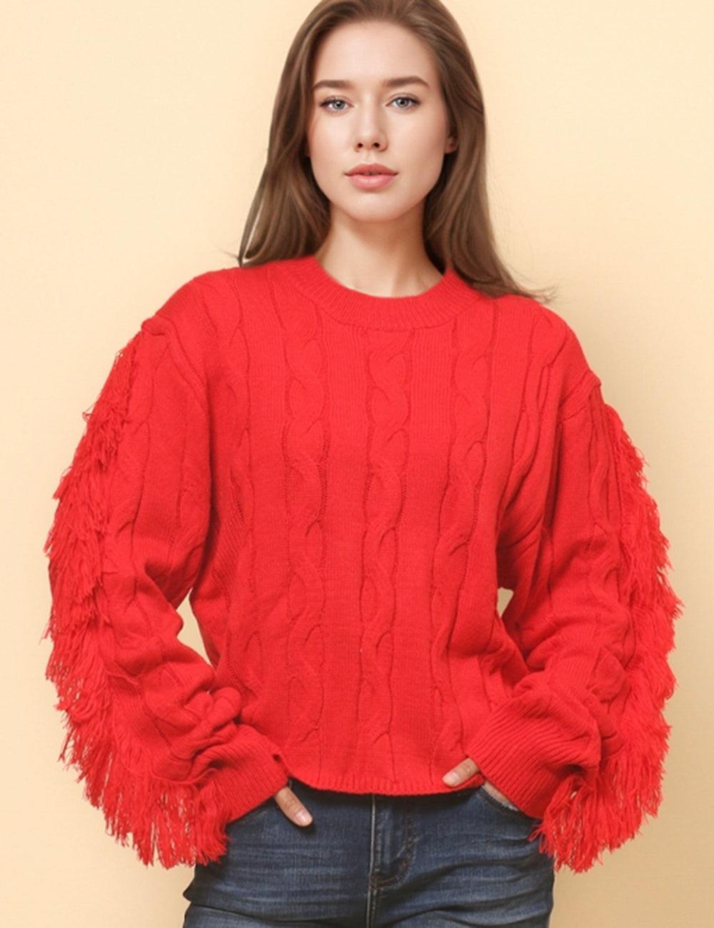 Ladies Solid Color Round Neck Tassels Pullover Sweater SKT4902